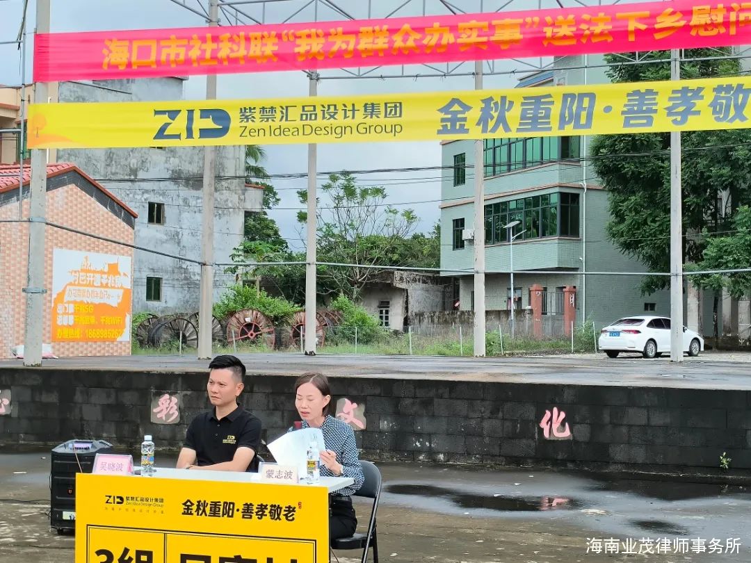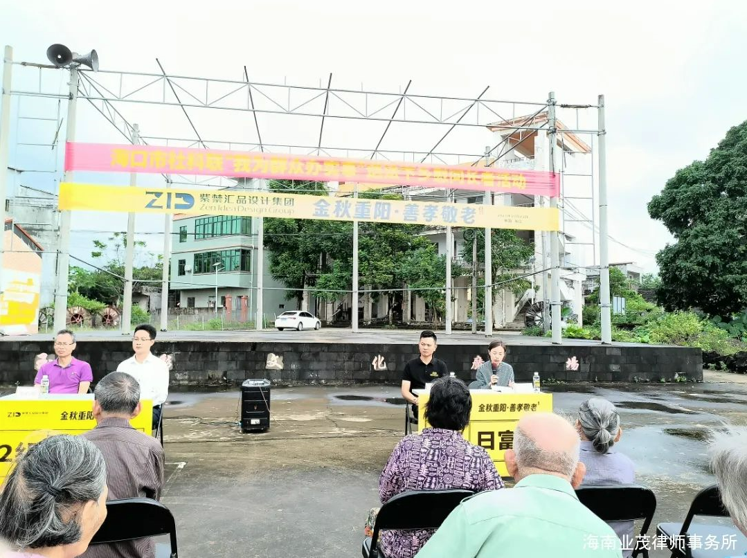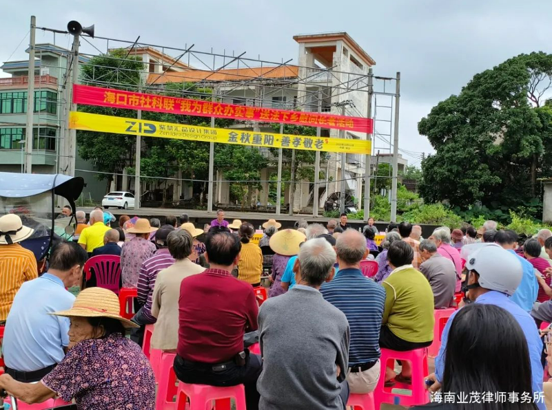 金秋重阳根据学习贯彻习近平新时代中国特色社会主义思想主题教育工作要求,海口市社会科学界联合会于2023年10月21日上午在海口市龙华区新坡镇群丰村委会开展“九九重阳节”慰问长者暨“送法下乡”活。此次活动包含“有奖趣味活动”、“送法下乡”、“发放慰问品”,海南业茂律师事务所积极协助参与该活动,特委派蒙志波律师负责“送法下乡”讲座。