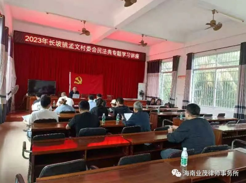 为深入学习宣传贯彻党的二十大精神和习近平法治思想,落实省第八次党代会精神,根据省委宣传部、省司法厅、省委全面依法治省委员会守法普法协调小组办公室、省普法依法治理领导小组办公室《关于印发<2023年海南省“民法典进乡村”主题宣传方案>的通知》(琼普治办〔2023〕7号)及省律师协会制定的《海南省“百所进千村”民法典普法活动实施方案》要求,2023年11月14日海南业茂律师事务所赵海、卢玉燕律师到琼海市长坡镇孟文村开展“百所进千村”民法典普法活动。此次活动分为民法典普法宣讲、《民法典宣传手册》讲解发放以及为村办企业进行“法治体检”活动。