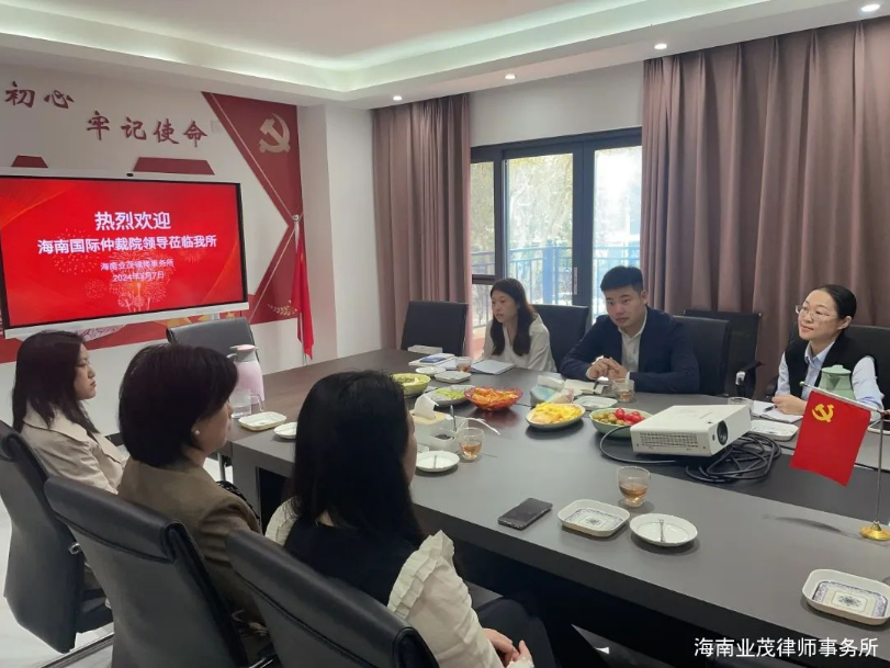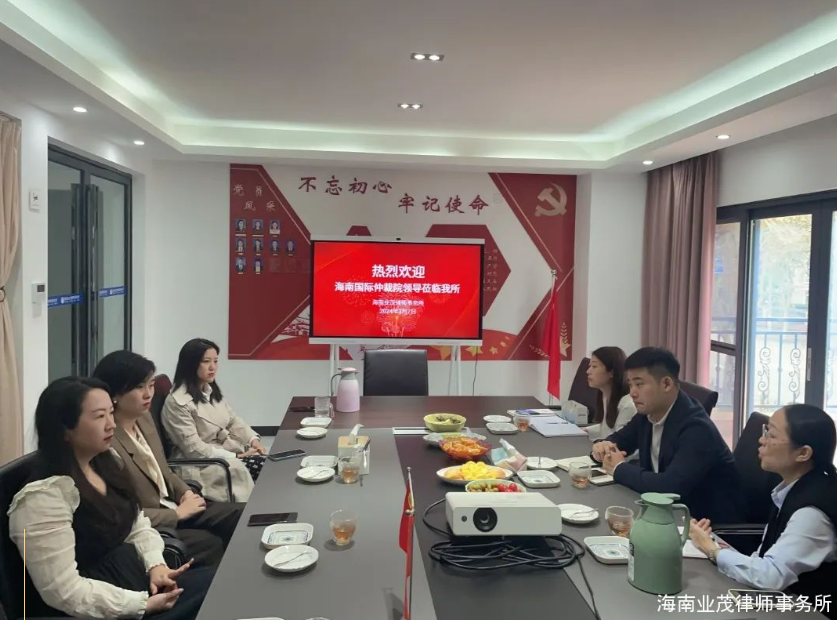 2024年3月7日上午,海南国际仲裁院发展部主任倪玮、副主任赵丹丹、宗绍璟到访业茂律所交流。业茂律所主任于欢,党支部书记周仙、律师柯晓蕾热情接待并参与了交流会。