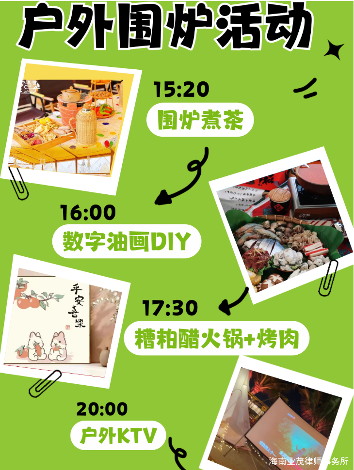 中午小憩后,我们驱车前往Z时代国风露营地举办户外围炉煮茶活动,一炉、一壶、几杯、干果、茶食、闲谈,尽情享受惬意时光。国风露营地有做旧的木栈道、有国风氛围的桌布及对联,风景独美,拍照分分钟出片。同时,律所还为我们每个人都准备了各式各样图案的数字油画,虽然过程很费眼睛也费力气,但是完成后很有成就感,DIY数字油画让大家有机会当一回“美术家”,体验绘画艺术带来的视觉享受。