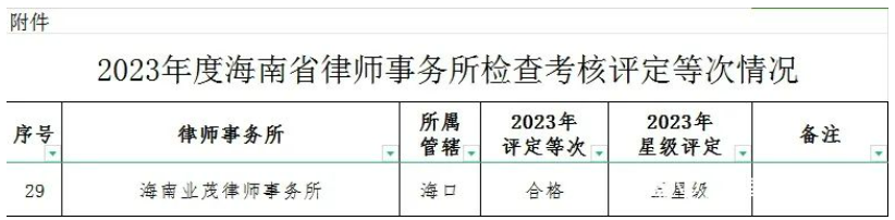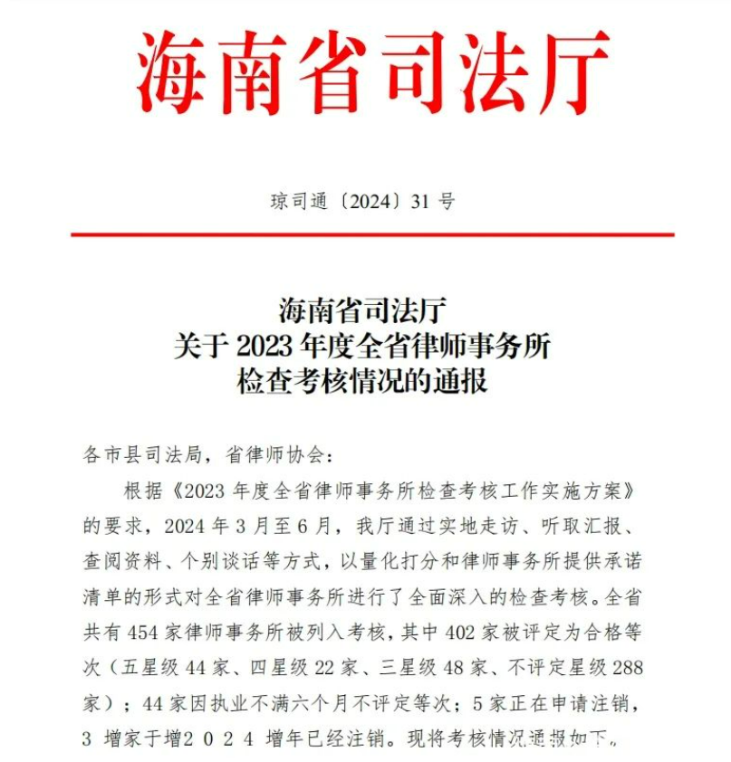 2023年度全省律师事务所检查考核圆满结束,海南省司法厅通过实地走访、听取汇报、查阅资料、个别谈话等方式,以量化打分的形式对全省律师事务所进行了全面深入的检查考核。全省共有454家律师事务所被列入考核,其中402家被评定为合格等次(五星级44家、四星级22家、三星级48家、不评定星级288家)。我所在此次考核中,被评定为“五星级”律师事务所。我所已连续三年荣获“五星级”律师事务所称号,感谢海南省司法厅对我所的肯定和认可。