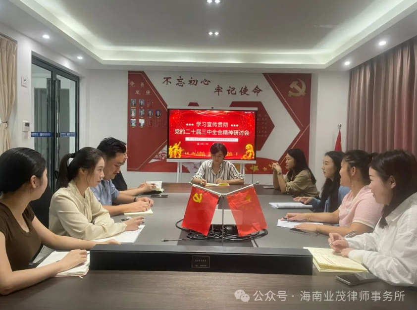 为深入学习宣传贯彻党的二十届三中全会精神,认真贯彻落实党中央决策部署,海南业茂律师事务所于2024年9月24日下午组织召开《学习贯彻党二十届三中全会精神研讨会》,本次学习研讨会由本所党支部周仙书记担任主讲人,党员、积极分子和本所律师参与学习和讨论。