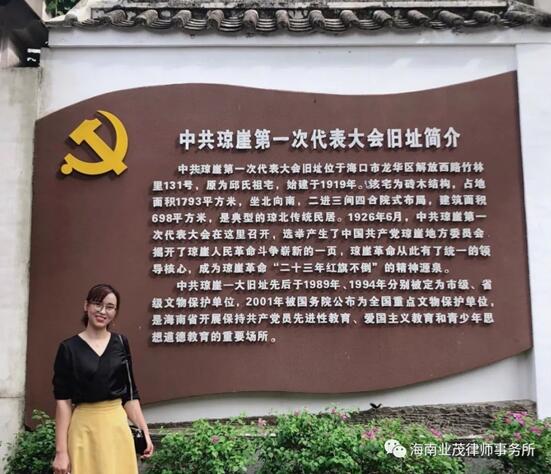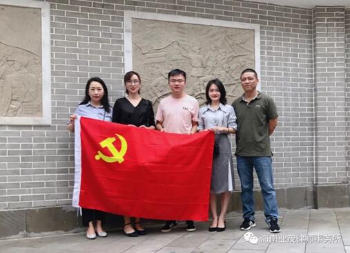 2019年6月30日,在中国共产党建党98周年之际,为缅怀革命先烈,传承革命精神,中共海南业茂律师事务所党支部党员周仙、赵海、柯晓蕾、黄星豪、曾昭云来到“中共琼崖第一次代表大会旧址”,开展“参观党史教育基地,学习革命先烈事迹”为主题的七一党日活动。
