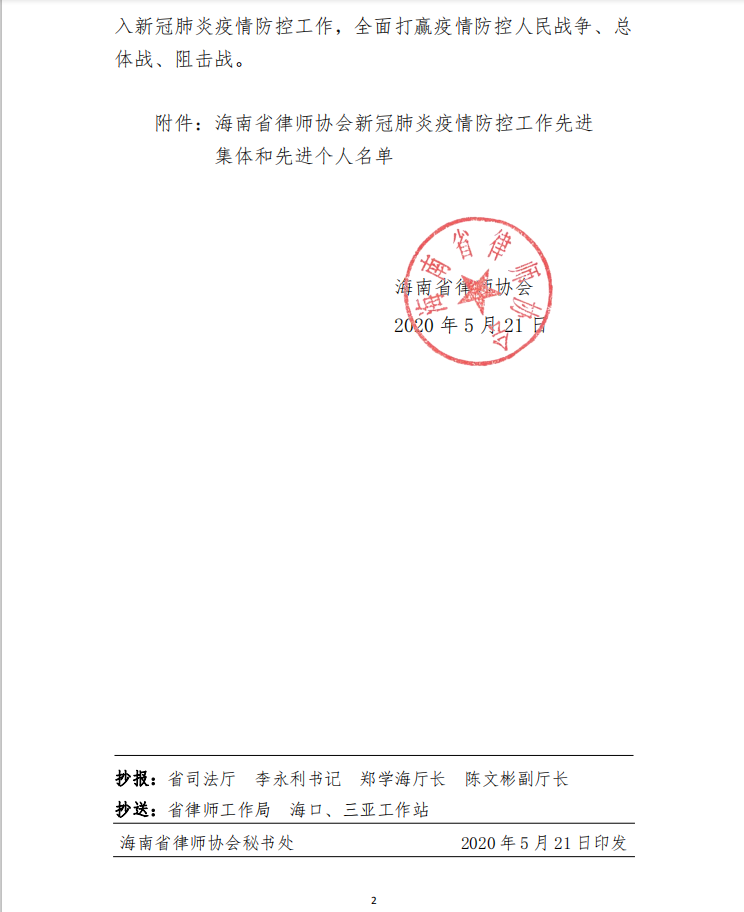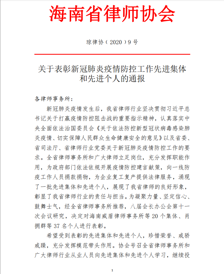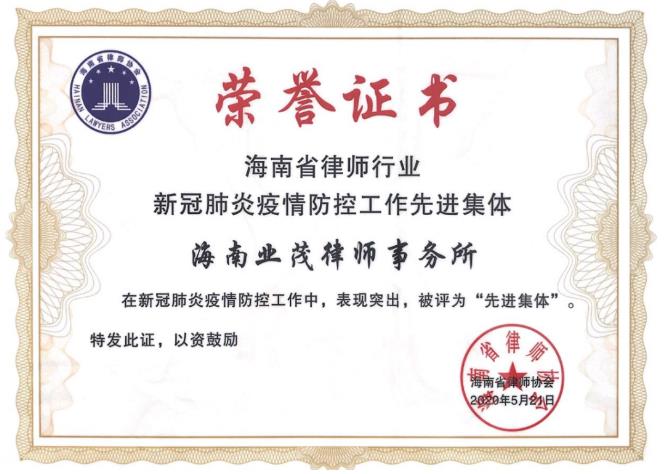 新冠肺炎疫情发生后,我所响应号召,积极参与新冠肺炎疫情防控的各项工作。因此,荣获海南省律师行业关于新冠肺炎疫情防控工作先进集体的表彰。