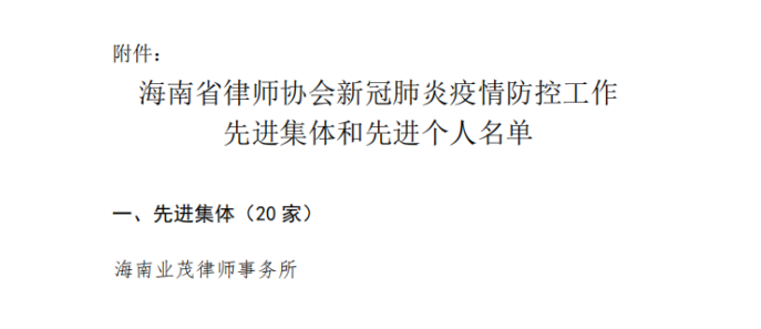海南业茂律师事务所新冠肺炎疫情防控工作荣获先进集体荣誉表彰