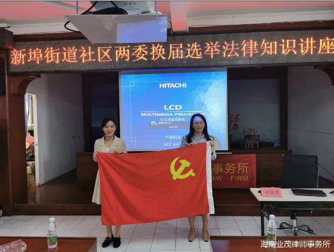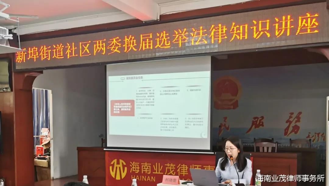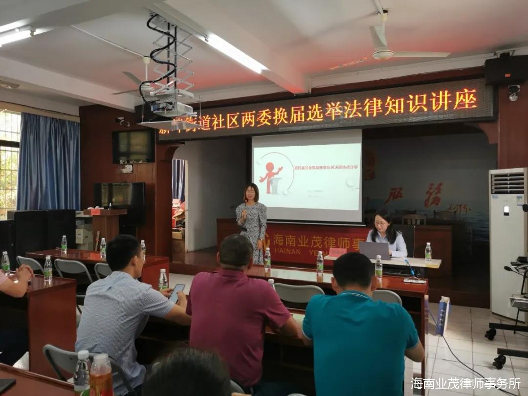 为配合我省村(社区)“两委”正在进行的换届选举工作,充分发挥村(居)法律顾问的专业优势,确保换届选举工作依法有序进行,在海南省律师协会开展专项法治宣传活动的号召下,海南业茂律师事务所及其党支部指派纪检委员柯晓蕾律师主要负责与执行主任于欢、党支部副书记陈思宇、党支部宣传委员蔡夏夏、实习律师冯欣组成法制宣讲团,于2021年3月19日上午9点为新埠街道办开展了一场居民委员会换届选举的法律知识讲座。参加活动的人员有新埠街道干部、三角社区、土尾社区村委及村民小组和若干社区居民。