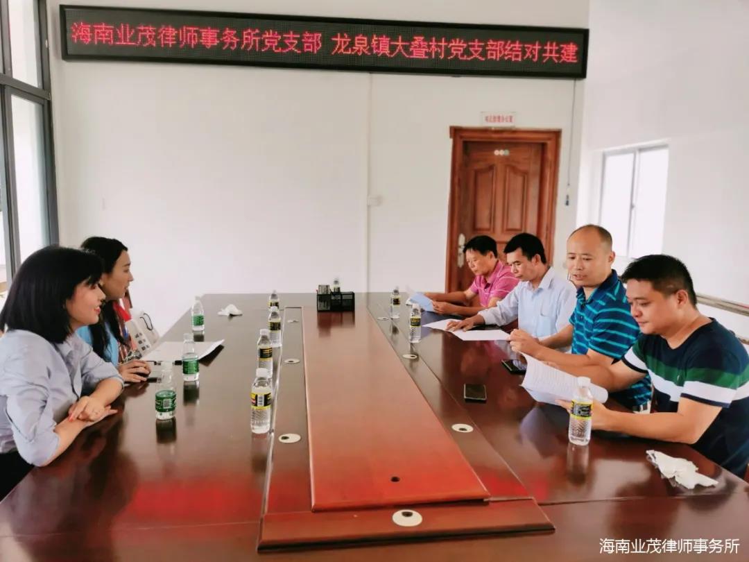 为贯彻落实党中央、国务院关于乡村振兴战略的重大决策部署,响应省司法厅、省律师行业党委号召,为乡村振兴提供优质高效的法律服务和法治保障,2021年9月1日下午,海南业茂律师事务所党支部与海口市龙华区龙泉镇大叠村党支部在大叠村开展党建结对活动,并共同签署了《律师事务所党支部与村党支部结对情况备案表》。