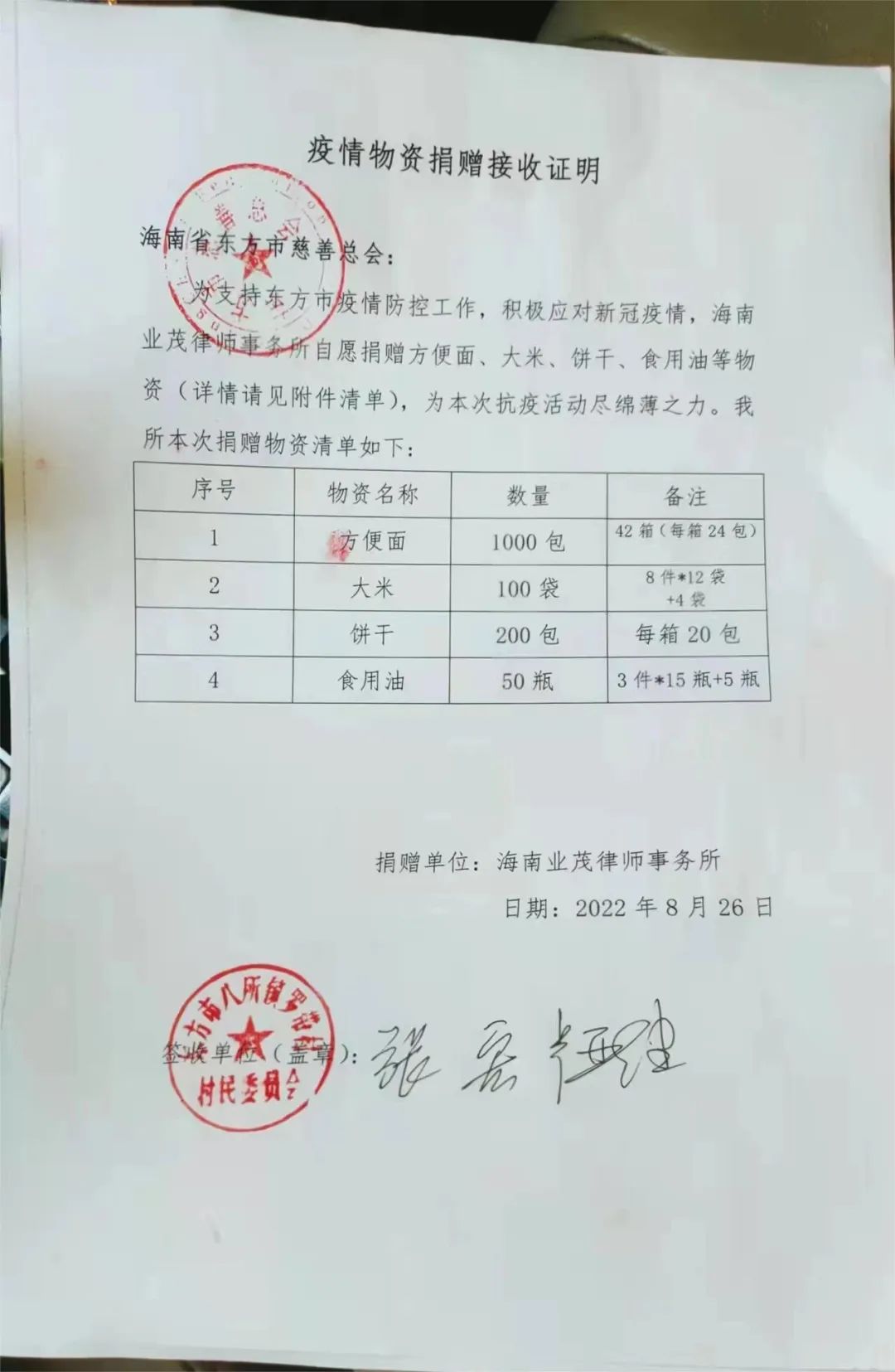 近段时间,海南疫情突然爆发,三亚及其他多数市县都被疫情的阴霾笼罩着,海南人民处在水深火热之中。面对严峻的疫情,海南业茂律师事务所主动参与疫情防控工作,除了律师参与抗疫志愿者活动,律所还主动联系东方市慈善总会负责人,了解当地所需情况,自发组织律师进行捐款,将筹集款用于购买大米、食用油、饼干及方便面,并将物资运送到疫情高发区东方市,由慈善总会分发到需要帮助的人员手里,为他们解决物资匮乏问题。